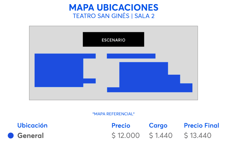 - El Teatro y el Centro Cultural San Ginés abren sus puertas 1 hora antes de la hora de función para recibir al público. El acceso a la sala se habilita 15 minutos antes del inicio del espectáculo.