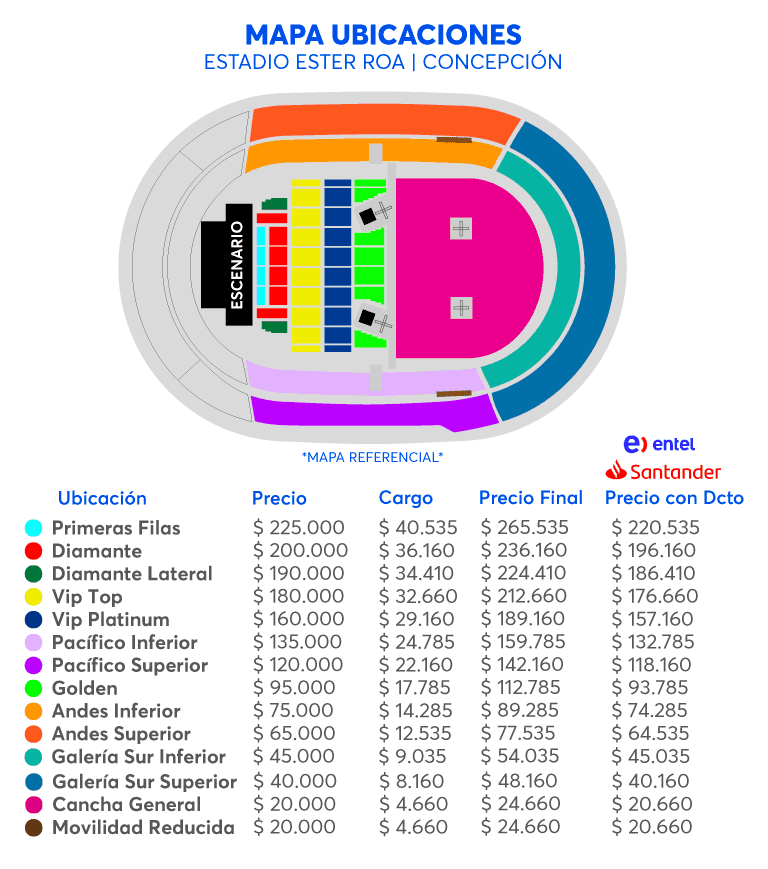 - Preventa exclusiva para clientes Santander, se realizará desde el miercoles 08 de Octubre a las 11:00 hrs. hasta el viernes 10 de Octubre a las 10:59hrs. o hasta agotar stock. Máximo 4 tickets por compra.