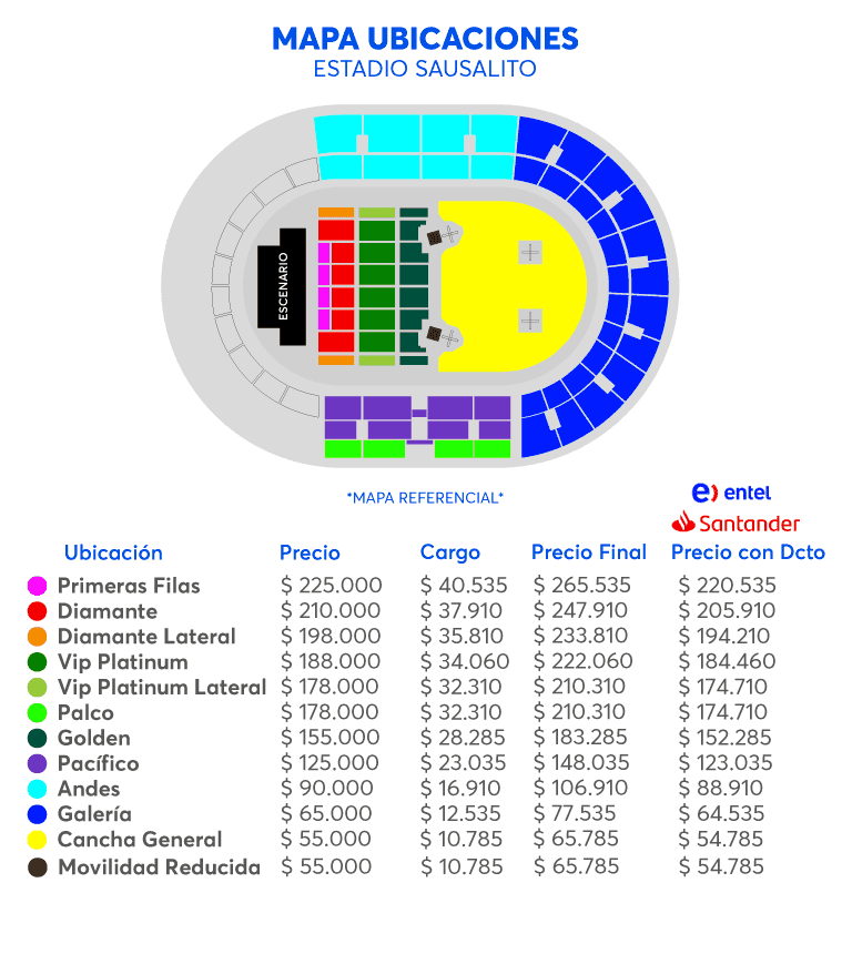 - Preventa exclusiva para clientes Santander, se realizará desde el miércoles 10 de Septiembre a las 12:00 hrs. hasta el viernes 12 de Septiembre a las 11:59hrs. o hasta agotar stock. Máximo 4 tickets por compra.