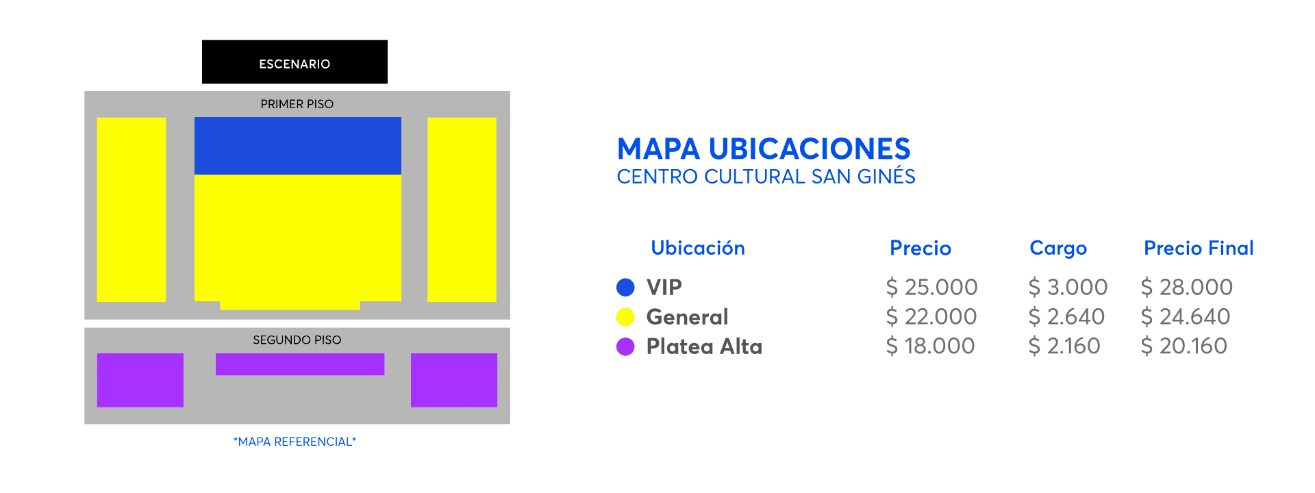 - El Teatro y el Centro Cultural San Ginés abren sus puertas 1 hora antes de la hora de función para recibir al público. El acceso a la sala se habilita 15 minutos antes del inicio del espectáculo.