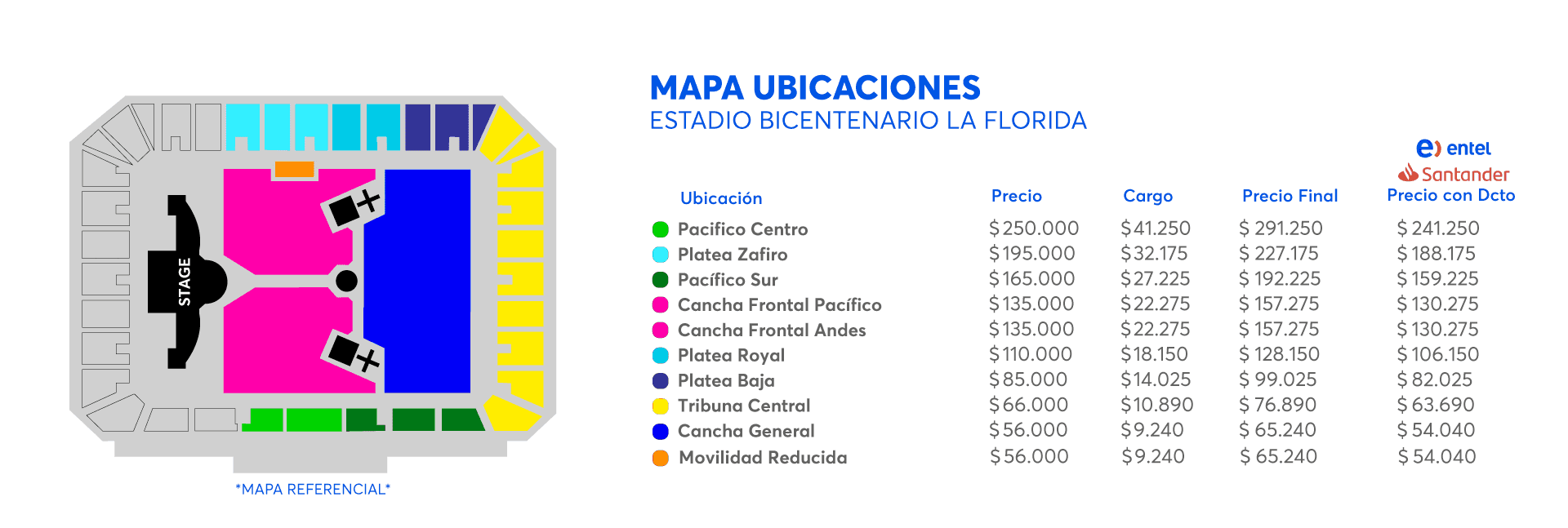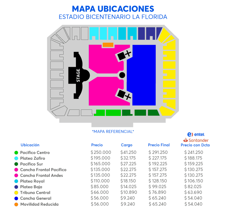 - Preventa exclusiva para clientes Entel, se realizará desde el Lunes 04 de Mayo a las 11:00 hrs. hasta el Miércoles 06 de Mayo a las 11:00hrs. o hasta agotar stock. Máximo 4 tickets por compra.