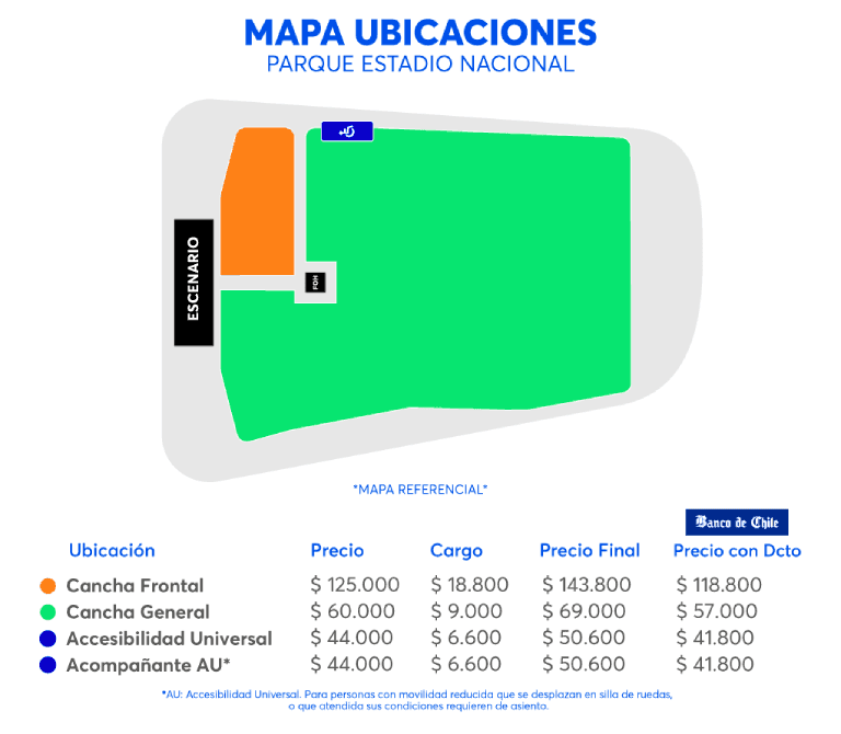 - Preventa exclusiva Banco de Chile disponible desde el Miércoles 6 de Agosto de 2025 a las 12:00 hrs. Hasta agotar stock de 21.000 entradas. De las cuales un stock de 5.000 entradas tiene un 20% de descuento pagando con tarjetas Banco de Chile, máximo 6 entradas por cliente.