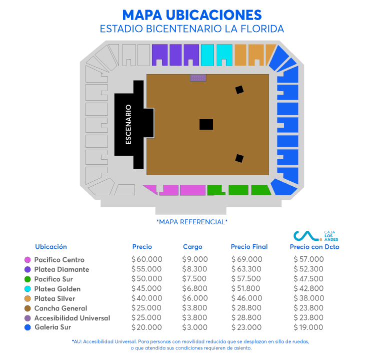 - Preventa exclusiva Caja Los Andes disponible desde el Viernes 19 de Diciembre de 2025 a las 12:00 hrs. hasta el Sábado 20 de Diciembre a las 11:59hrs. o hasta agotar stock de 2.500 entradas. Máximo 2 entradas por cliente.