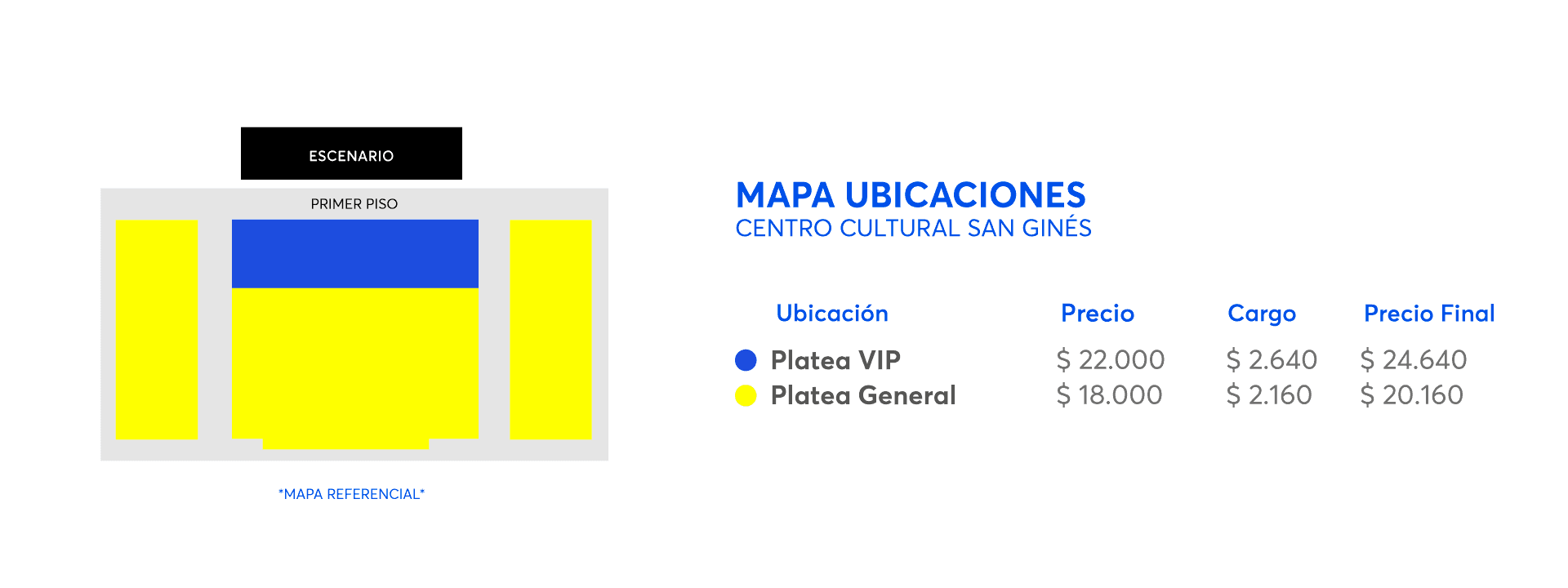 - El Teatro y el Centro Cultural San Ginés abren sus puertas 1 hora antes de la hora de función para recibir al público. El acceso a la sala se habilita 15 minutos antes del inicio del espectáculo.