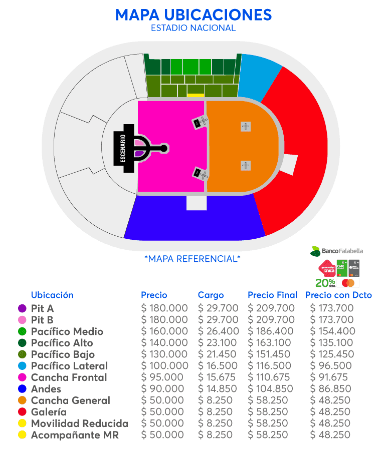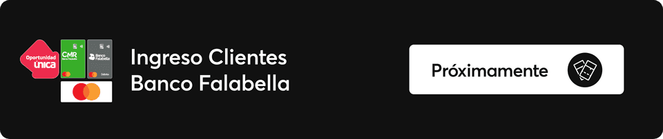 Promoción válida durante la preventa exclusiva para Banco Falabella, hasta agotar stock de 6.000 tickets. Descuento pagando con tarjetas Mastercard de Banco Falabella y no aplica en el cargo por servicio. Términos, condiciones y exclusiones de los descuentos y de las oportunidades únicas en www.bancofalabella.cl. Descuento de exclusiva responsabilidad del comercio. El pago con tarjetas de crédito puede tener costos asociados. Consultar al emisor para mayor información. Infórmese sobre la garantía estatal de los depósitos en su banco o en www.cmfchile.cl. 4 entradas por compra.